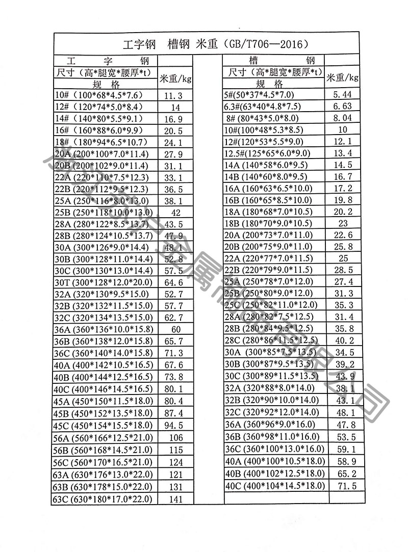 .在相同的高度下,輕型槽鋼比普通槽鋼的腿窄、腰薄、重量輕。18 -40 號為大型槽鋼,5 -16 號槽鋼為中型槽鋼。進口槽鋼標明實際規格尺寸及相關標準。槽鋼的進出口定貨一般是在確定相應的碳結鋼(或低合金鋼)鋼號后,以使用中所要求的規格為主。除了規格號以外,槽鋼沒有特定的成分和性能系列。